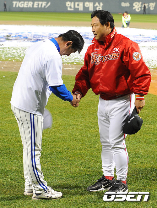 경기 후 SK 이만수 감독이 삼성 류중일 감독을 축하하고 있다.