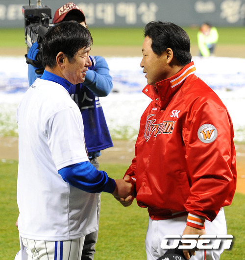 경기 후 삼성 류중일 감독과 SK 이만수 감독이 악수를 나누고 있다.