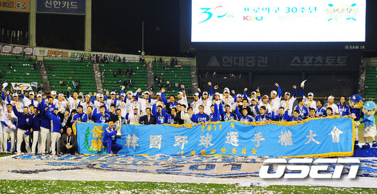 삼성 라이온즈가 한국시리즈 챔피언컵을 거머쥐었다. 삼성은 31일 잠실구장서 열린 SK 와이번스와의 2011 한국시리즈 5차전서 강봉규의 4회 선제 결승 좌월 솔로포 등을 앞세워 로 승리했다. 시리즈 전적 4승 1패로 삼성은 2006년 이후 5년 만에 왕좌에 올랐다. 1985년 전후반기 통합 우승까지 합치면 통산 5번째 패권을 잡았다.