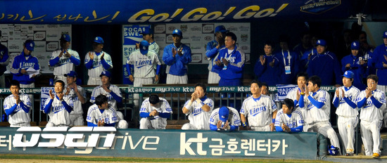 아웃카운트 하나 남겨 놓은 상태에서 9회초 삼성 선수들이 두손을 모아 기도하고 있다. /soul1014@osen.co.kr