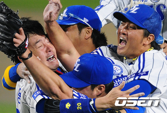 우승을 확정지은 삼성 진갑용이 동료선수들과 끌어 안고 기뻐하고 있다. /jpnews@osen.co.kr