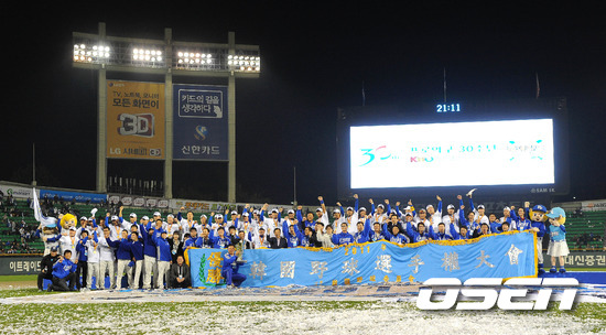 삼성 선수들과 코칭스태프가 우승 기념 사진을 촬영하고 있다.