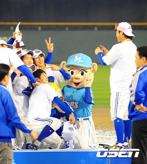 삼성 라이온즈가 한국시리즈 챔피언컵을 거머쥐었다. 삼성은 31일 잠실구장서 열린 SK 와이번스와의 2011 한국시리즈 5차전서 강봉규의 4회 선제 결승 좌월 솔로포 등을 앞세워 로 승리했다. 시리즈 전적 4승 1패로 삼성은 2006년 이후 5년 만에 왕좌에 올랐다. 1985년 전후반기 통합 우승까지 합치면 통산 5번째 패권을 잡았다.