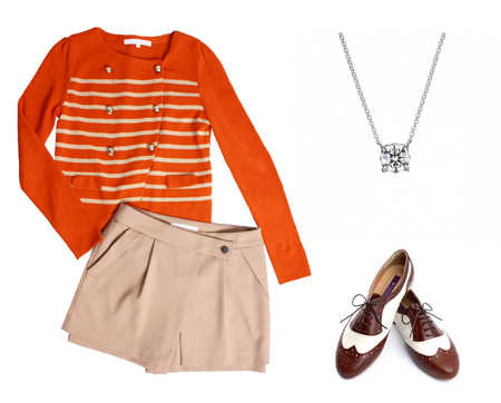 사랑스러운 오렌지 컬러의 카디건에 베이지 톤 쇼트팬츠를 매치하면 가을을 만끽하는 여인의 스타일링이 된다. 이때 반짝이는 목걸이는 필수.