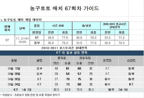 [농구토토] 국민체육진흥공단(www.kspo.or.kr)이 발행하는 체육진흥투표권 수탁사업자인 스포츠토토 공식 온라인 발매사이트인 베트맨(www.betman.co.kr)이 오는 2일 오후 7시 사직실내체육관에서 벌어지는 KT-동부전 대상 농구토토 매치 67회차 투표율을 중간 집계한 결과, 전체 참가자의 40.12%는 양 팀간 10점 이내 박빙 승부를 예상했다.