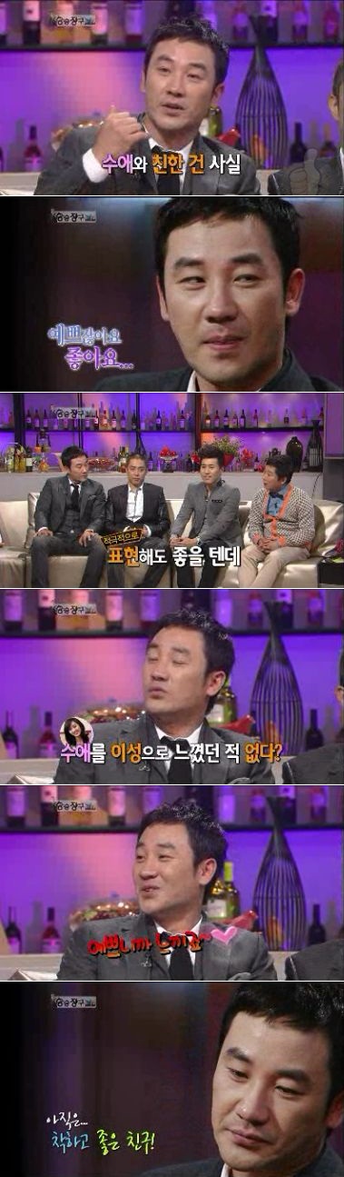 이에 MC 이수근이 "근데 왜 수애에게 표현을 안 하나? '만나 볼 생각 없니?'라고 물어볼 수 있지 않나?"고 묻자 엄태웅은 "알아 온 시간이 길어서 이런(우정) 사이가 좋다"며 "서로 애인이 생기면 또 멀어진다"고 말했다.