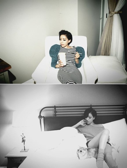 사진 속에 가인은 소파에 앉아 음료를 마시고 있다. 또 다른 사진에는 고양이와 함께 침대 위에 올라 관능미 넘치는 눈빛으로 한 곳을 응시하고 있다. 특히 하의 실종 패션이 파격적이다.