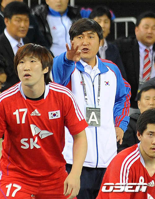 6일 오후 서울 송파구 방이동 SK올림픽핸드볼경기장에서 열린 한국과 일본의 '2012 런던올림픽 아시아 예선 결승전', 후반 한국 최석재 감독이 선수들에게 작전을 지시하고 있다.