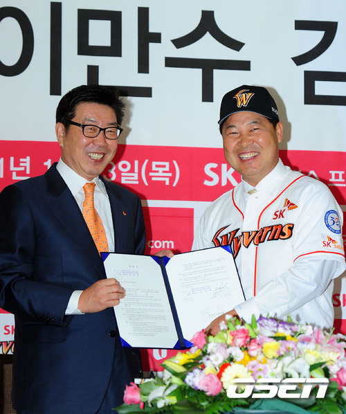 SK는 지난 1일 이만수 신임감독과 계약기간 3년에 계약금 2억5000만원, 연봉 2억5000만원으로 총액 10억원에 계약을 체결했다. 역대 초보 감독 계약 조건으로는 최고 대우 수준이다.