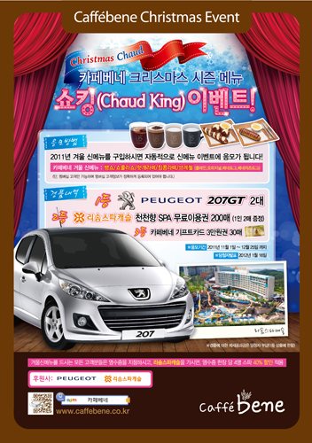 1등 2명에게 ‘푸조 207GT’ 를 증정하고, 2등으로 당첨된 100명에게 리솜스파캐슬 천천향SPA 무료이용권을 2매씩 제공한다. 3등 30명에겐 ‘카페베네 기프트카드 3만 원 권’ 을 증정한다.