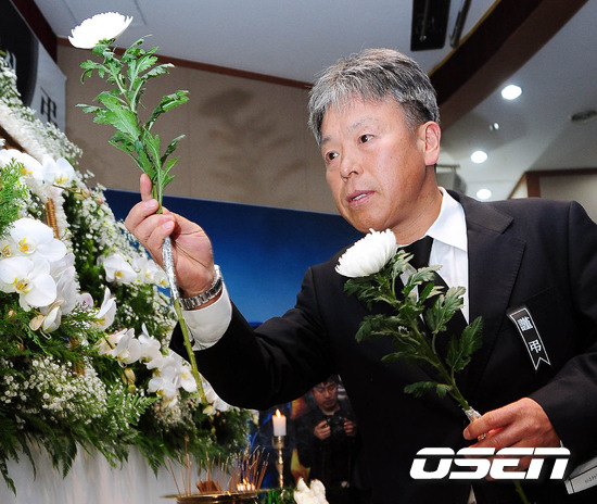 히말라야 안나푸르나에 '코리안 루트'를 개척하다 실종된 고 박영석 대장과 강기석, 신동민 대원에 대한 합동 영결식이 3일 오전 서울 종로구 연건동 서울대학교병원 생명연구원에서 엄수된 가운데 산악인 엄홍길 대장이 헌화를 하고 있다.