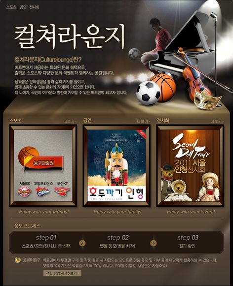 한편 베트맨은 고객들이 스포츠, 공연, 전시회 등 각종 문화혜택 이벤트에 보다 손쉽게 참여할 수 있도록 2일 홈페이지 내 '컬처라운지' 페이지를 새로 오픈했다. 베트맨은 이를 계기로 앞으로 이벤트 대상 문화공연을 확대하고 초청 인원도 늘려서 보다 많은 고객들에게 문화공연 혜택을 제공할 계획이다.