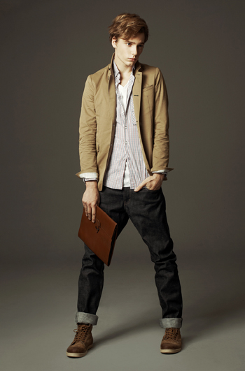 다양한 스타일링 아이템이기도 한 데님팬츠는 어떤 스타일링에도 빠지지 않는 사계절 머스트 해브 아이템이다. 트렌디한 베이지 컬러 재킷과 체크 셔츠, 와인컬러 클러치 백을 매치해 청담동 클러버 룩을 표현한다. 자연스럽게 롤업된 데님팬츠는 멋스러운 댄디남 패션을 선보였다.