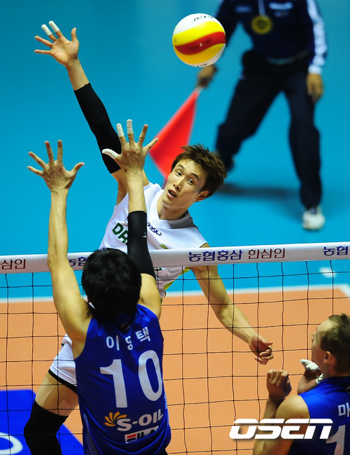 3일 오후 서울 중구 장충 체육관에서 열린 'NH농협 2011-2012 V리그' 드림식스와 대한항공의 경기에서 드림식스의 최홍석이 대한항공 이영택 마틴의 블로킹을 피해 연타를 날리고 있다.