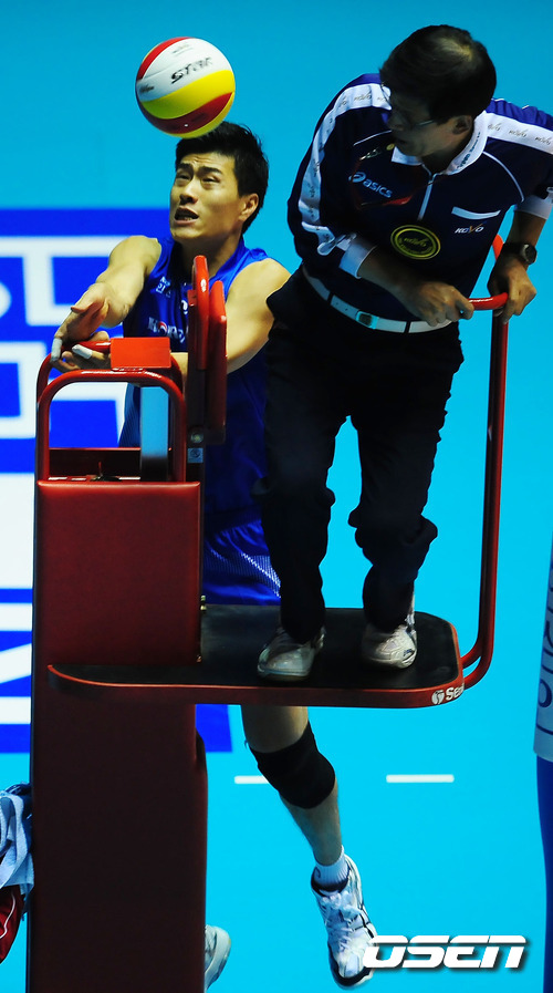 3일 오후 서울 중구 장충 체육관에서 열린 'NH농협 2011-2012 V리그' 드림식스와 대한항공의 경기에서 대한항공 김영래가 김건태 주심 쪽으로 날아가는 볼을 받으려 하고 있다.