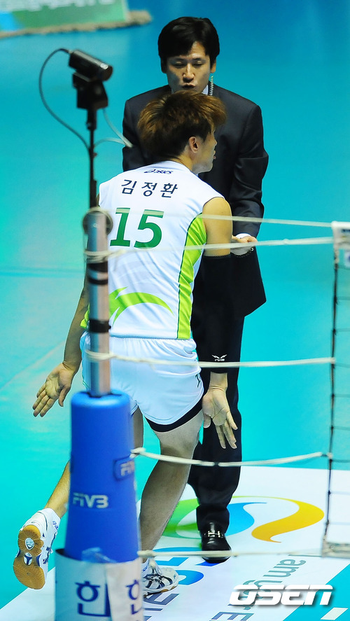 3일 오후 서울 중구 장충 체육관에서 열린 'NH농협 2011-2012 V리그' 드림식스와 대한항공의 경기에서 드림식스의 김정환이 공격에 성공한 후 박희상 감독과 하이파이브를 하고 있다.