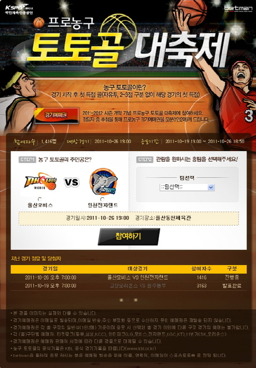 한편 '토토골'의 주인공을 정확히 맞힌 농구팬 가운데 추첨을 통해 총 50명에게 프로농구 자신이 원하는 구단의 홈경기를 관전할 수 있는 경기예매권(1인 2매)을 경품으로 지급한다.
