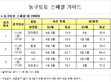 [농구토토] 국민체육진흥공단(www.kspo.or.kr)이 발행하는 체육진흥투표권 수탁사업자인 스포츠토토 공식 온라인 발매 사이트인 베트맨(www.betman.co.kr)은 오는 5일 오후 3시부터 펼쳐지는 전자랜드-SK(1경기), 동부-KGC(2경기), LG-오리온스(3경기)전 등 국내 프로농구 3경기를 대상으로 한 농구토토 스페셜 29회차 투표율 중간집계 결과, 참가자들은 동부-KGC(2경기)전에서 양 팀간 박빙 승부를 점쳤다.