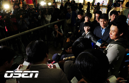 이승엽이 취재진에 둘러싸여 인터뷰를 하고 있다.