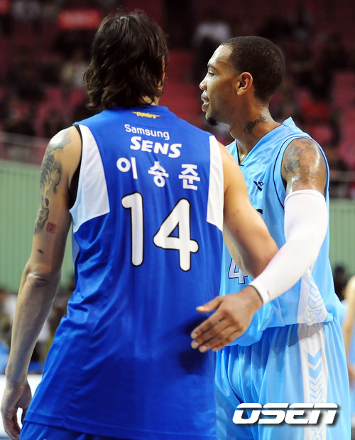 [OSEN=잠실실내체 ,백승철 인턴기자] 4일 오후 서울 잠실 실내체육관서 열린 '2011-2012 KB국민카드 프로농구' 서울 삼성과 울산 모비스의 경기 종료 후 모비스 토마스와 삼성 이승준이 서로 격려를 하고 있다.