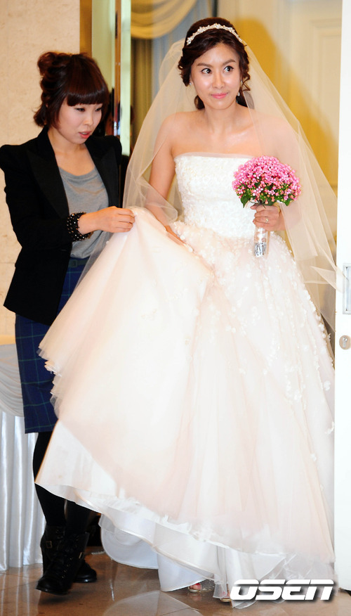 [OSEN= 백승철 인턴기자] 5일 오전 서울 삼성동 라마다 서울 호텔에서 열린 개그우먼 성현주의 결혼식에서 성현주가 동료 오나미의 도움을 받으며 포토타임 단상으로 이동하고 있다.