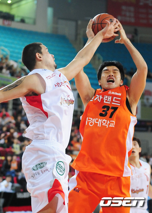 [OSEN=인천 ,백승철 인턴기자] 5일 오후 인천 삼산월드체육관서 열린 '2011-2012 KB국민카드 프로농구' 인천 전자랜드와 서울 SK의 경기 1쿼터 전자랜드 주태수가 SK 김민수를 앞에두고 골밑슛을 시도하고 있다.