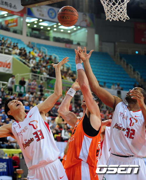 [OSEN=인천 ,백승철 인턴기자] 5일 오후 인천 삼산월드체육관서 열린 '2011-2012 KB국민카드 프로농구' 인천 전자랜드와 서울 SK의 경기 1쿼터 전자랜드 브로만이 SK 이현준, 존슨 사이에서 리바운드 다툼을 하고 있다.