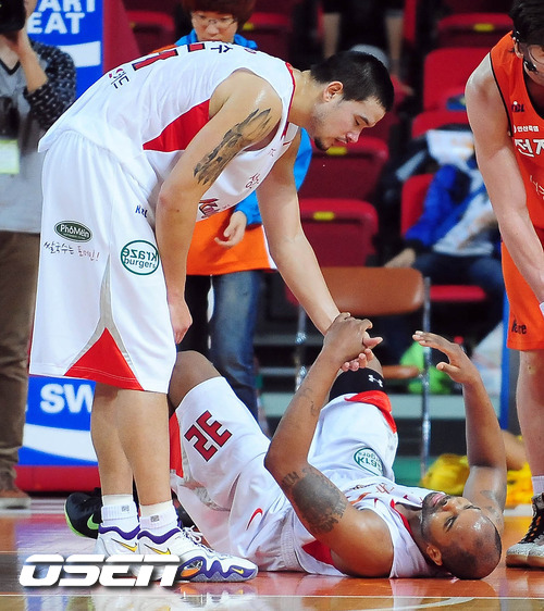 [OSEN=인천 ,백승철 인턴기자] 5일 오후 인천 삼산월드체육관서 열린 '2011-2012 KB국민카드 프로농구' 인천 전자랜드와 서울 SK의 경기 3쿼터 SK 김민수가 넘어진 존슨에게 손을 내밀고 있다.