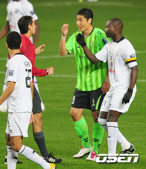 5일 오후 전주월드컵경기장에서 열린 전북 현대(한국)와 알 사드(카타르)의 2011 AFC 챔피언스리그 결승전, 전반 전북 정성훈과 알 사드 수비수가 주심 판정에 불만을 나타내고 있다.