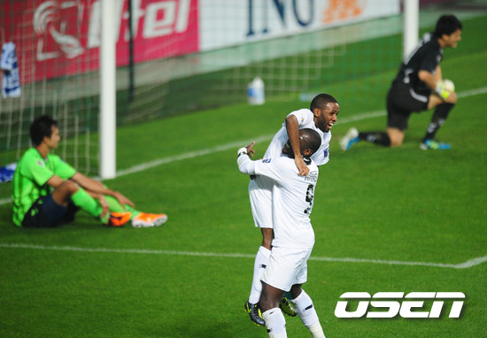 5일 오후 전주월드컵경기장에서 열린 전북 현대(한국)와 알 사드(카타르)의 2011 AFC 챔피언스리그 결승전, 전반 전북 심우연의 자책골로 동점에 성공한 알 사드 선수들이 기뻐하고 있다.