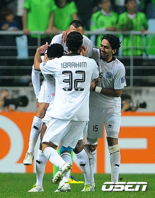 5일 오후 전주월드컵경기장에서 열린 전북 현대(한국)와 알 사드(카타르)의 2011 AFC 챔피언스리그 결승전, 전반 전북 심우연의 자책골로 동점에 성공한 알 사드 선수들이 환호하고 있다.