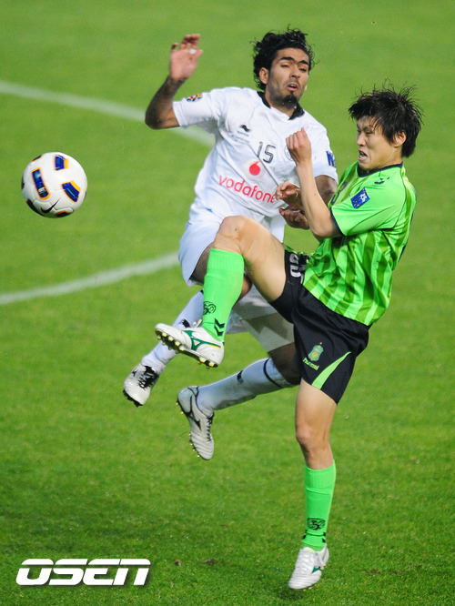 5일 오후 전주월드컵경기장에서 열린 전북 현대(한국)와 알 사드(카타르)의 2011 AFC 챔피언스리그 결승전, 후반 전북 박원재가 알 사드 수비수와 충돌하고 있다.