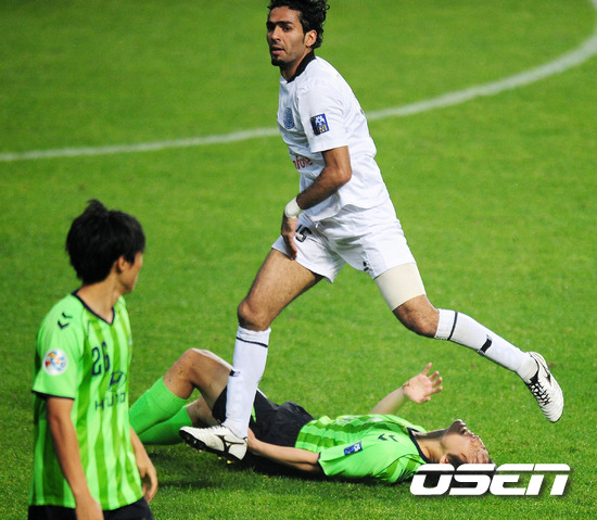 5일 오후 전주월드컵경기장에서 열린 전북 현대(한국)와 알 사드(카타르)의 2011 AFC 챔피언스리그 결승전, 후반 전북 박원재가 알 사드 수비수와 충돌후 넘어지며 괴로워하고 있다.