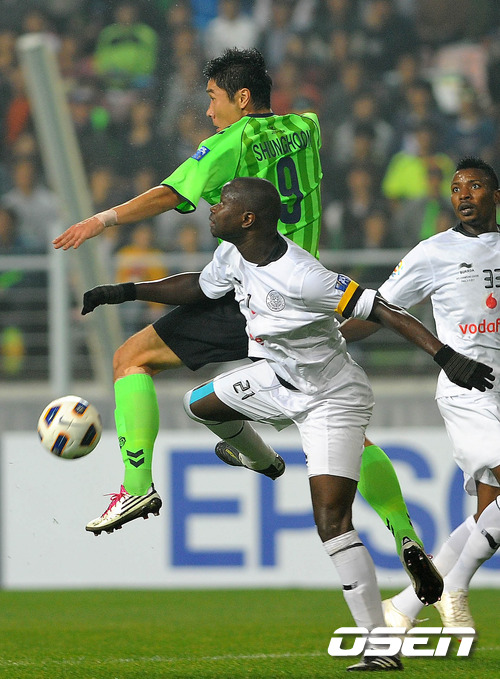 5일 오후 전주월드컵경기장에서 열린 전북 현대(한국)와 알 사드(카타르)의 2011 AFC 챔피언스리그 결승전, 전반 전북 정성훈이 알 사드 수비와 공중볼 다툼을 하고 있다.