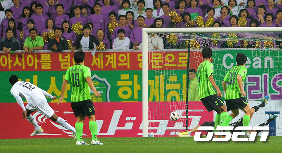 5일 오후 전주월드컵경기장에서 열린 전북 현대(한국)와 알 사드(카타르)의 2011 AFC 챔피언스리그 결승전, 후반 전북 선수들이 알 사드 케이타에게 역전골을 허용하고 있다.