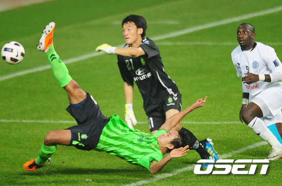 5일 오후 전주월드컵경기장에서 열린 전북 현대(한국)와 알 사드(카타르)의 2011 AFC 챔피언스리그 결승전, 연장 전반 전북 심우연이 볼을 걷어내지 못했지만 김민식 골키퍼가 잡아내고 있다.