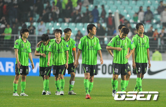 승부차기서 우승을 놓친 전북 선수들이 아쉬운 표정으로 벤치로 향하고 있다.
