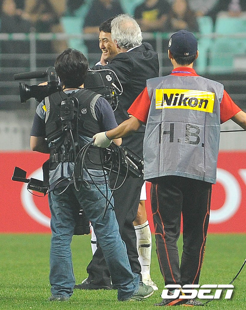 알 사드 이정수가 포사티 감독과 우승의 기쁨을 나누고 있다.