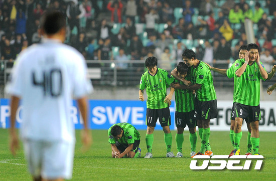 전북 현대는 5일 저녁 전주 월드컵경기장서 열린 알 사드(카타르)와 '아시아축구연맹(AFC) 챔피언스리그 2011' 결승전에서 이승현이 후반 종료 직전 2-2 동점골을 넣었지만 승부차기에서 2-4로 패배했다. 전북은 지난 2006년 대회 우승 이후 5년 만의 왕좌 탈환을 눈 앞에서 놓치고 말았다. / sunday@osen.co.kr