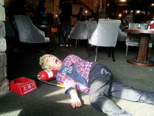 사진 속 장동민은 레스토랑 바닥에 소화기를 베개 삼아 누워있으며 입을 크게 벌리고 숙면을 취하는 것 같은 모습을 연출했다. 피곤함에도 촬영장을 떠나지 않고 구석에서 잠을 청할 수 있다는 열정을 보여주고자 한 듯하다.