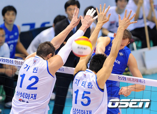 6일 오후 대전 충무실내체육관에서 열린 2011-2012 NH농협 V-리그 남자부 삼성화재와 대한항공의 경기, 2세트 대한항공 마틴이 삼성화재 가빈과 지태환의 블로킹을 피해 강타를 날리고 있다.