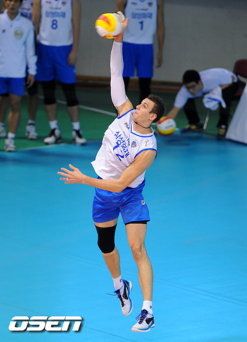 6일 오후 대전 충무실내체육관에서 열린 2011-2012 NH농협 V-리그 남자부 삼성화재와 대한항공의 경기, 1세트 삼성화재 가빈이 서브를 시도하고 있다.