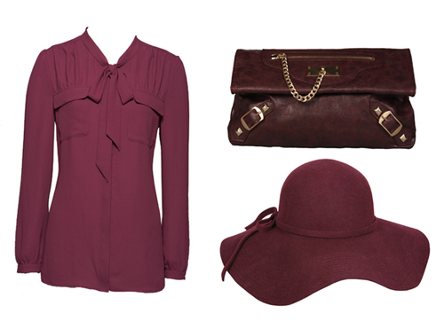 와인 컬러의 블라우스는 뚝 떨어지는 라인의 하이웨이스트 와이드 팬츠와 매치하여 성숙하고 도시적인 복고 스타일을 연출할 수 있다. 또는, 격식 있는 자리에서 다소 딱딱한 느낌을 줄 수 있는 정장 수트 스타일링에서도 와인 컬러의 클러치백 하나로 부드럽고 교양 있는 여성미를 드러낼 수 있다.