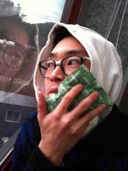 사진 속 이켠은 하얀색 후드 모자를 쓴 채 창 밖을 바라보고 있다. 얼굴 찜질을 위해 사용하고 있는 초록색 핫팩이 인상적이다.