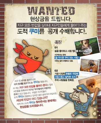 '도적 쿠미를 공개 수배합니다'는 타이틀이 붙은 이번 이벤트는 반려동물의 귀엽고 사랑스러운 모습이 담긴 사진을 찍어 댓글로 올리면 강아지 캐릭터인 쿠미와 가장 비슷한 사진을 뽑아 아이패드2를 증정하는 방식이다. 또 이벤트에 참여하면 반려동물을 위한 사료, 간식, 장난감, 아이수 물티슈 등 선물세트를 받을 수 있다.