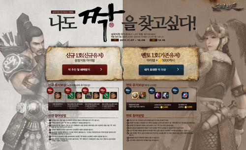기존 유저가 초대한 유저의 성장을 도우며 함께 게임을 즐기고, 초대 받은 신규 유저가 20, 30, 40, 50레벨을 달성할 때마다 신규, 기존 유저 모두 보상 아이템을 지원 받을 수 있다. 신규 유저에게는 빠른 성장을 돕는 만능물약과 동전 주머니를, 기존 유저에게는 상급 결정석 등 강화 아이템과 5천캐시를 보상으로 제공한다.
