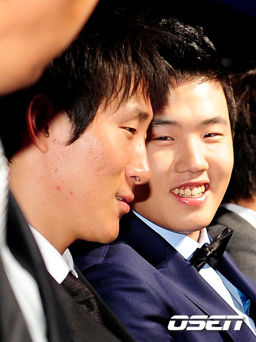 7일 오후 서울 삼성동 코엑스 인터하모니 볼룸에서 열린 '2011 롯데카드 프로야구' 최우수선수(MVP) 및 최우수신인선수, 부문별 시상식에서 배영섭 임찬규가 이야기를 나누고 있다.