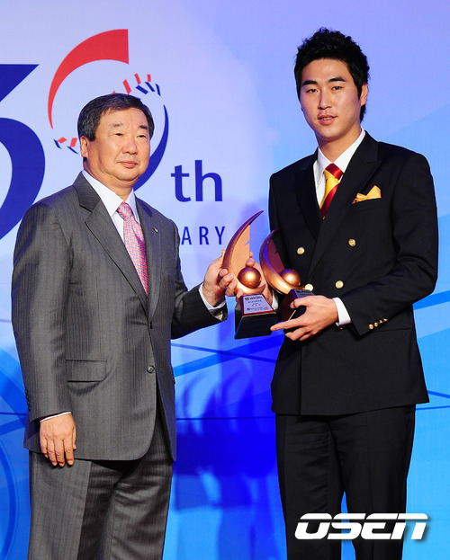 7일 오후 서울 삼성동 코엑스 인터하모니 볼룸에서 열린 '2011 롯데카드 프로야구' 최우수선수(MVP) 및 최우수신인선수, 부문별 시상식에서 퓨처스리그 북부리그 투수부문에 LG 우규민이 수상하고 있다.