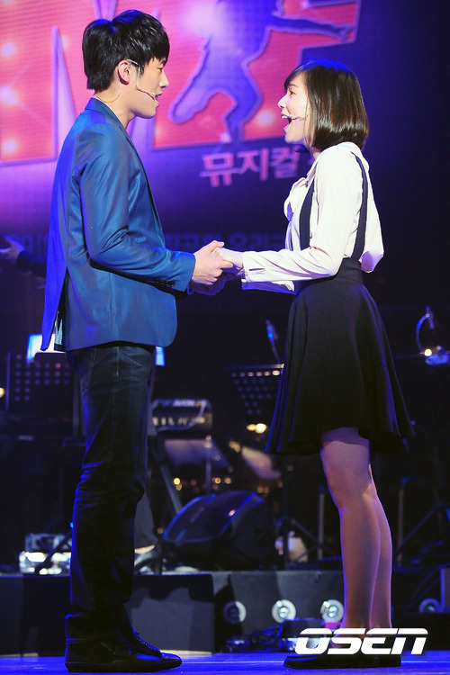 7일 오후 서울 종로구 동숭아트센터 동숭홀에서 열린 뮤지컬 '페임'의 쇼케이스에서 고은성과 린아가 손을 맞잡고 열창을 하고 있다.