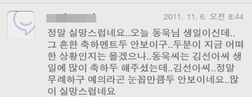 사진 속에는 악플러가 그에게 보낸 메시지로 추정되는 문구가 써져 있다. 김선아의 생일에는 배우 이동욱이 많이 축하를 해줬는데 정작 이동욱의 생일에는 김선아가 축하 멘트를 보내지 않아 무례하고 예의가 없다는 내용이다.